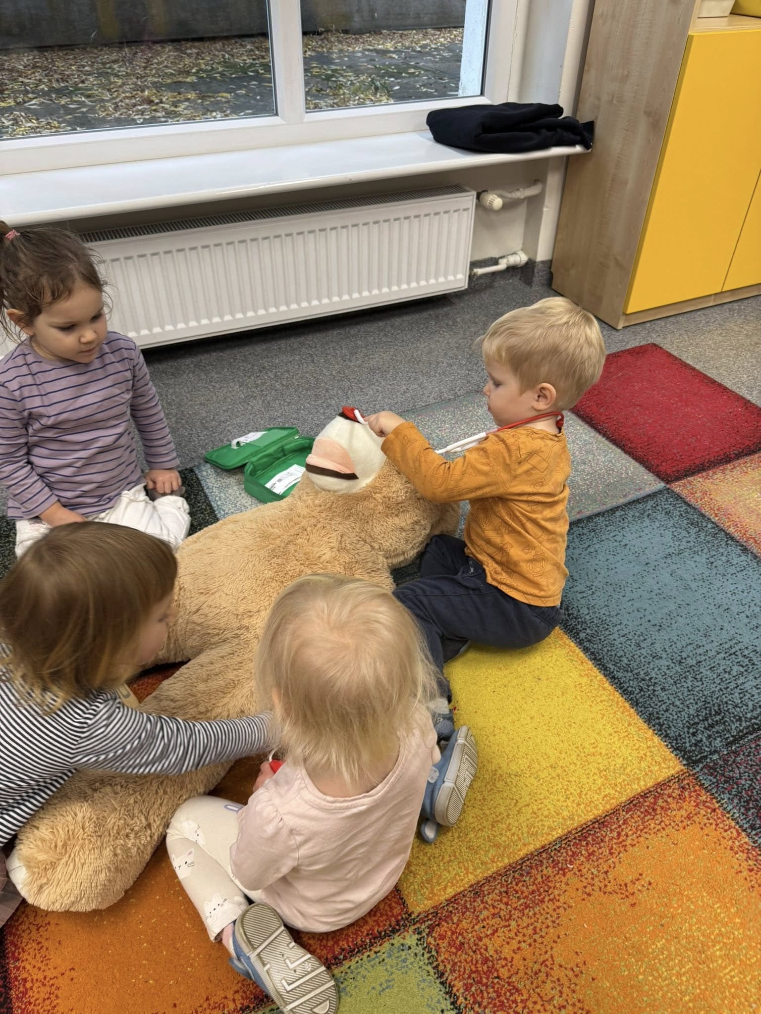 W październiku wszystkie nasze przedszkolaki wzięły udział w niezwykle ważnych zajęciach z Pierwszej Pomocy. Dzieci uczyły się, jak wezwać pomoc, co to jest pozycja boczna bezpieczna oraz jak prawidłowo wykonać uciśnięcia w resuscytacji krążeniowo-oddechowej na fantomie.