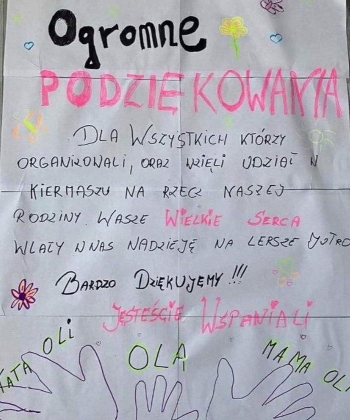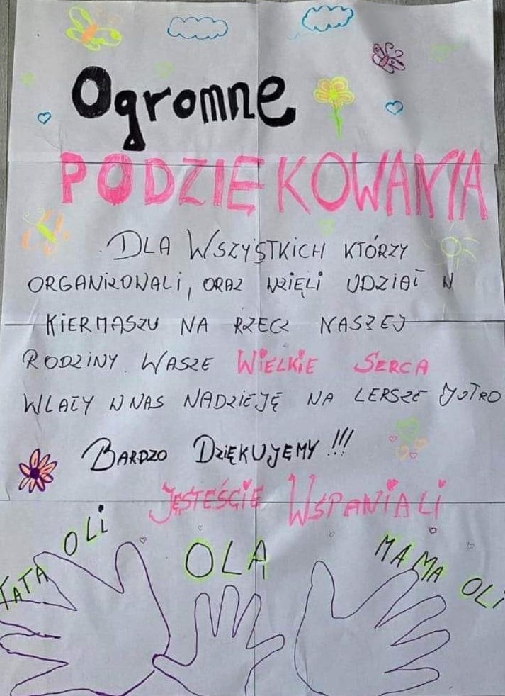 Na początku 2023 roku, jedno z dzieci uczęszczających do przedszkola - straciło w wyniku pożaru swój dom, spłonęły doszczętnie wszystkie rzeczy osobiste, ubrania, zabawki. Rada Rodziców zorganizowała pomoc - zebrane zostały wśród rodziców i całej przedszkolnej społeczności wszystkie najpotrzebniejsze artykuły, jak ubrania, środki czystości, nie zapomniano także o zabawkach. Rada Rodziców zorganizowała także słodką kawiarenkę - rodzice i pracownicy przedszkola wsparli naszą akcję i przygotowali słodkości, które następnie można było zakupić w holu przedszkola. Całkowity dochód ze sprzedaży ciast został przekazany poszkodowanej rodzinie.